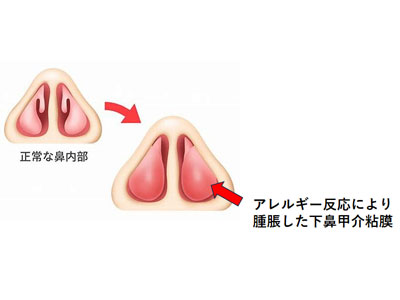 花粉症などのアレルギー性鼻炎では下鼻甲介が腫脹してくしゃみ、鼻汁、鼻閉が起きます