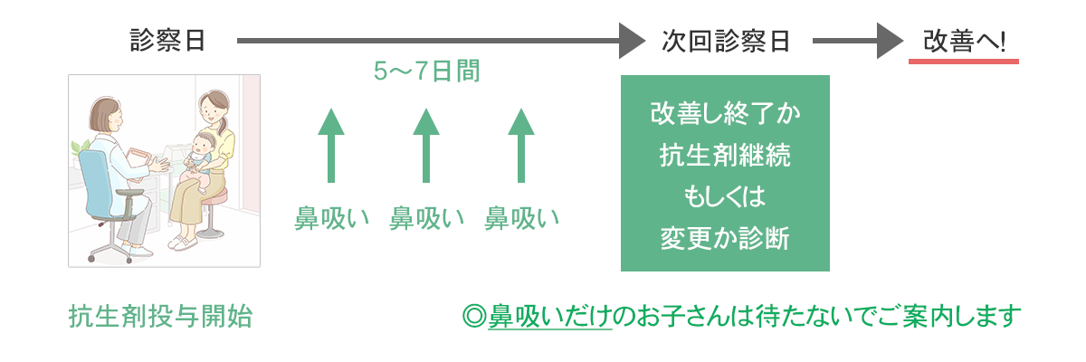 抗生剤を内服期間中に鼻を吸いに来てください。